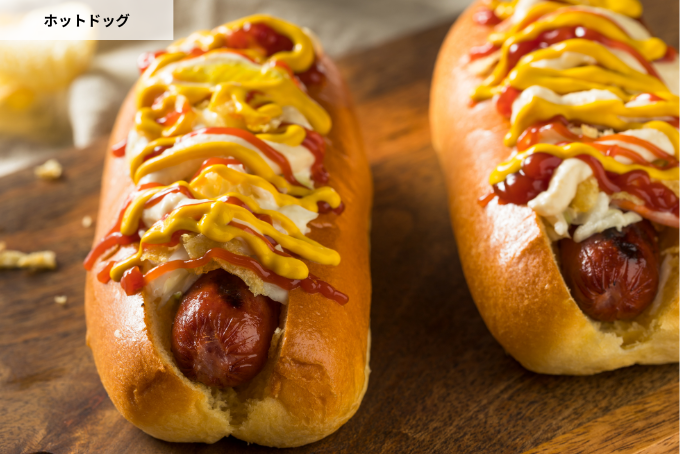 パリッと焼き上げたソーセージをふわっとしたバンズに挟み、ケチャップやマスタード、ザワークラウト、ピクルスなどをトッピング。