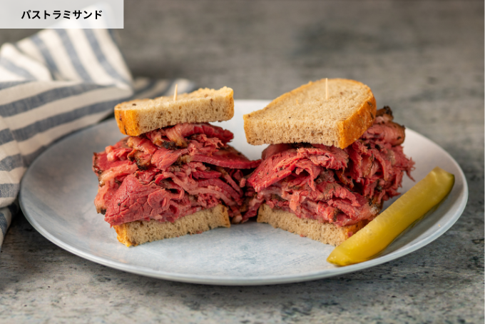 パンに、スモークされた香ばしいパストラミビーフをこれでもかと詰め込んだこのサンドイッチは、まさに“肉好きのためのごちそう”。